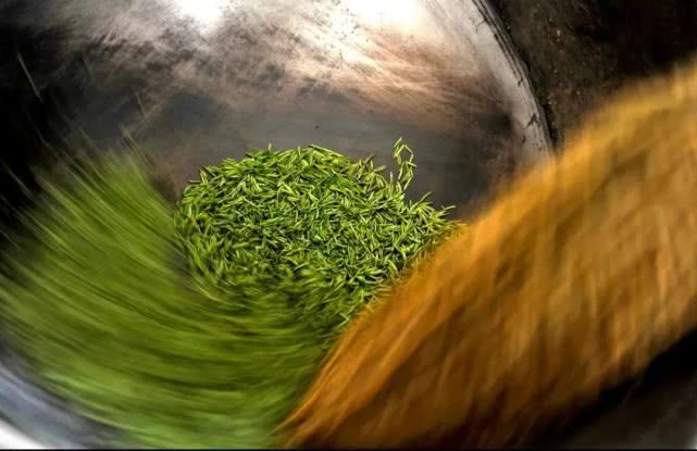 生锅面前,国家级非物质文化遗产信阳毛尖制作技艺传承人周祖宏和首批(绿茶类)国茶工匠·制茶大师伍德军正双手持着茶把,节奏地挥舞,满锅的鲜叶在两位大师的茶把下尽情的“翻滚”。