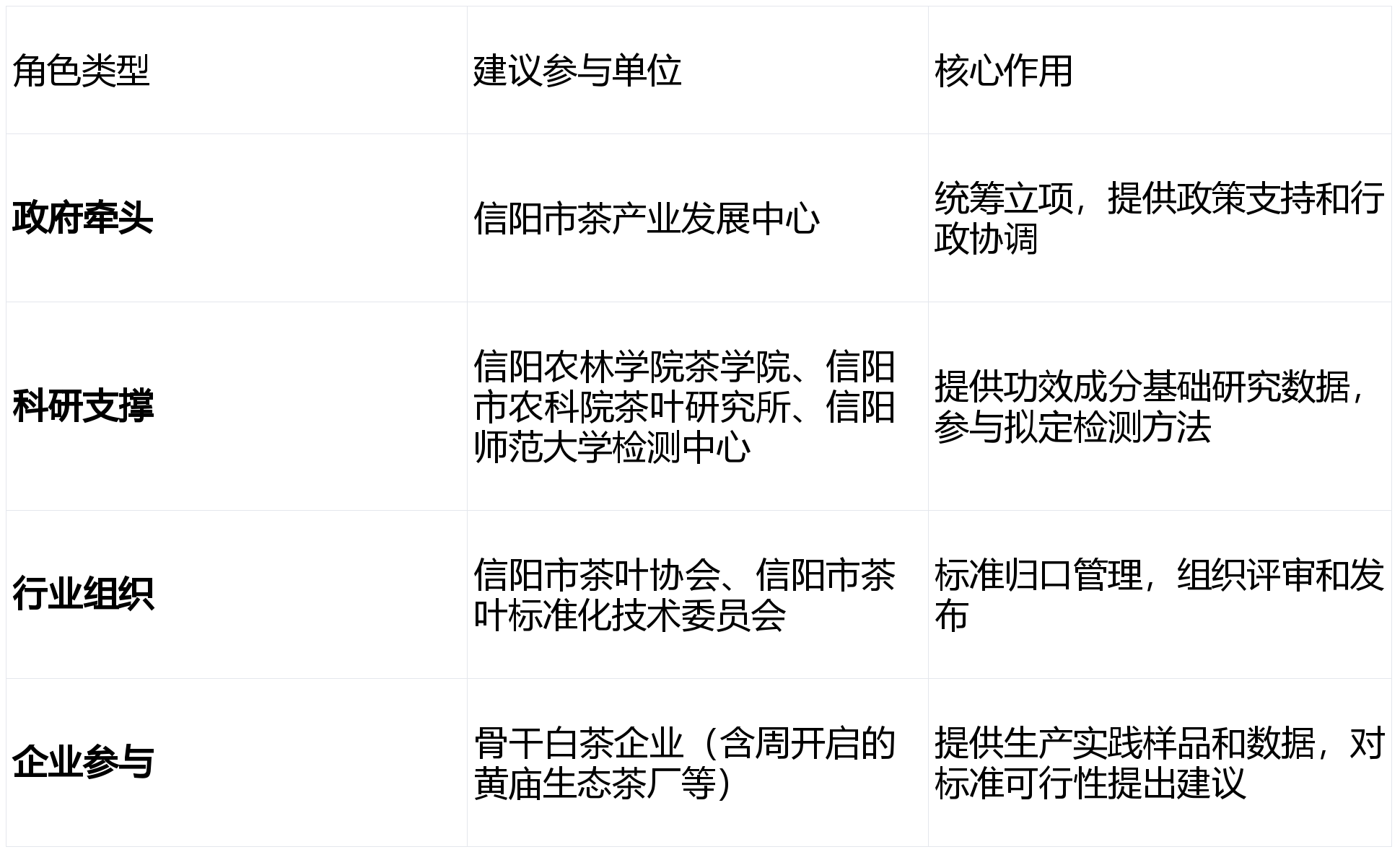 参考《信阳白茶》标准的起草阵容(周开启作为主要起草人之一),可以搭建如下制定团队: